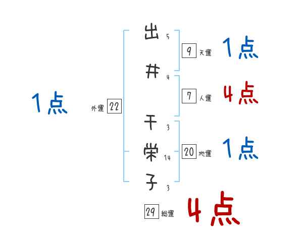 外運![]() | 出井千栄子さんの外運は22画の1つ星!努力することが苦手ないっぽう手先が器用。芸術性にも優れる。 生活面を象徴する運勢です。外部から受ける影響力を表し、結婚運、家庭運や職場、環境への順応性を表します。 |