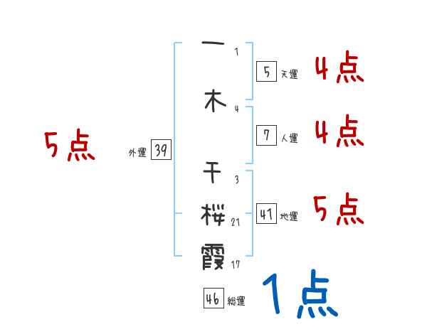 外運![]() | 一木千桜霞さんの外運は39画の5つ星!社交性に優れ人望が厚い。人の上に立ち成功する。 生活面を象徴する運勢です。外部から受ける影響力を表し、結婚運、家庭運や職場、環境への順応性を表します。 |