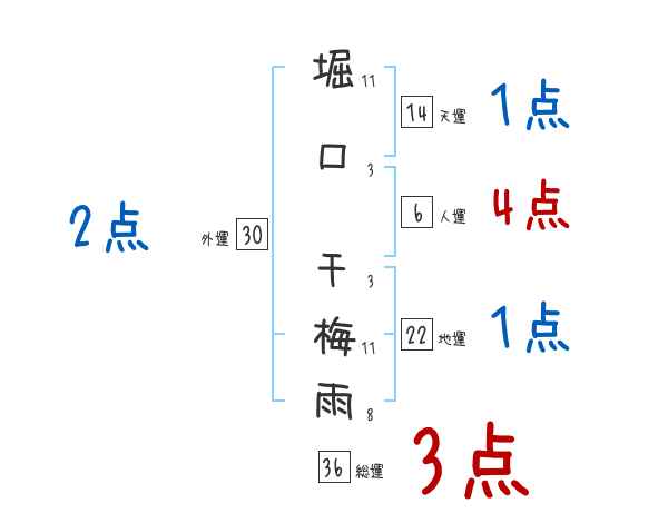 外運![]() | 堀口千梅雨さんの外運は30画の2つ星!浮き沈みの激しさに注意しましょう。 生活面を象徴する運勢です。外部から受ける影響力を表し、結婚運、家庭運や職場、環境への順応性を表します。 |