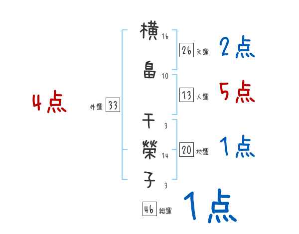 外運![]() | 横畠千榮子さんの外運は33画の4つ星!権力志向でプライドが高い。勇気があり運を切り開き成功する。 生活面を象徴する運勢です。外部から受ける影響力を表し、結婚運、家庭運や職場、環境への順応性を表します。 |