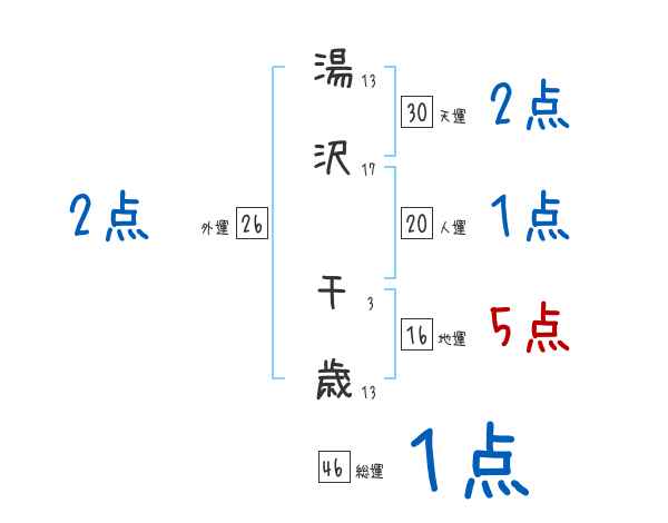 天運![]() | 湯沢千歳さんの天運は30画の2つ星!浮き沈みの激しさに注意しましょう。 家系が持つ宿命的な運勢を表します。祖先から受け継いだ苗字ですので自分の力が及びません。家柄を象徴します。 |