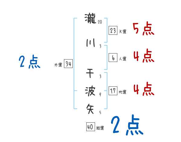 | 天運  | 瀧川千波矢さんの天運は23画の5つ星!想像力に優れ活力がある。一代で成功し名誉を手に入れる。家系が持つ宿命的な運勢を表します。祖先から受け継いだ苗字ですので自分の力が及びません。家柄を象徴します。 |