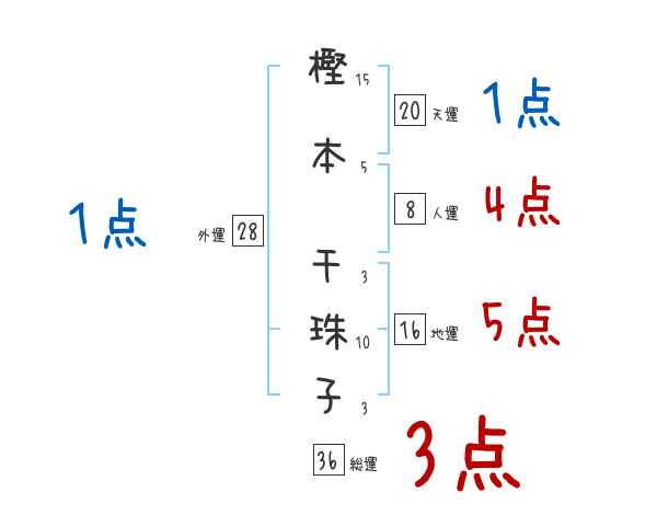 総運![]() | 樫本千珠子さんの総運は36画の3つ星!先見性が豊かです。多少神経質で苦労することも。 あなたの人生を表す1番重要な運勢です。生涯を通じて影響する総合運となり、主に50歳以降の晩年期に影響を及ぼします。 |