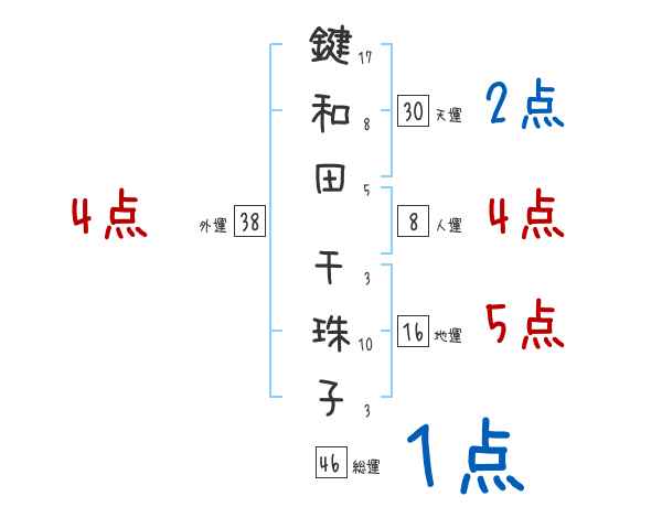 天運![]() | 鍵和田千珠子さんの天運は30画の2つ星!浮き沈みの激しさに注意しましょう。 家系が持つ宿命的な運勢を表します。祖先から受け継いだ苗字ですので自分の力が及びません。家柄を象徴します。 |