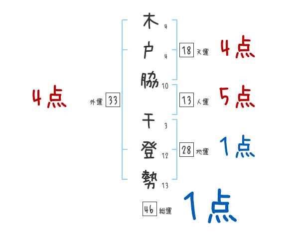 天運![]() | 木戸脇千登勢さんの天運は18画の4つ星!情熱的で剛気。忍耐力があり信頼される。 家系が持つ宿命的な運勢を表します。祖先から受け継いだ苗字ですので自分の力が及びません。家柄を象徴します。 |
