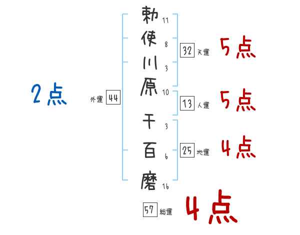 天運![]() | 勅使川原千百磨さんの天運は32画の5つ星!柔軟性があり成功する。チャンスが多く金運が良い。 家系が持つ宿命的な運勢を表します。祖先から受け継いだ苗字ですので自分の力が及びません。家柄を象徴します。 |