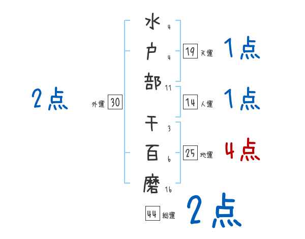 総運![]() | 水戸部千百磨さんの総運は44画の2つ星!誠実で慎重な性格。物事を考えすぎないように注意しましょう。 あなたの人生を表す1番重要な運勢です。生涯を通じて影響する総合運となり、主に50歳以降の晩年期に影響を及ぼします。 |