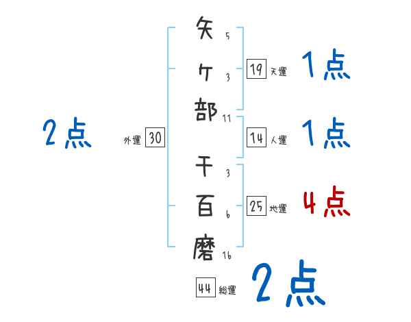 総運![]() | 矢ヶ部千百磨さんの総運は44画の2つ星!誠実で慎重な性格。物事を考えすぎないように注意しましょう。 あなたの人生を表す1番重要な運勢です。生涯を通じて影響する総合運となり、主に50歳以降の晩年期に影響を及ぼします。 |