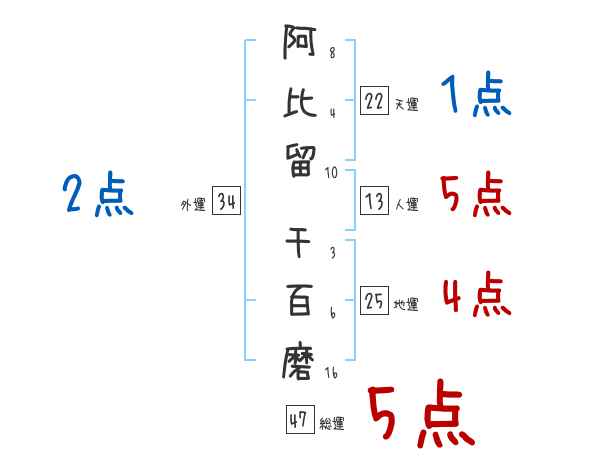 総運![]() | 阿比留千百磨さんの総運は47画の5つ星!実力が開花し発展する円満な人生。財に恵まれる。 あなたの人生を表す1番重要な運勢です。生涯を通じて影響する総合運となり、主に50歳以降の晩年期に影響を及ぼします。 |
