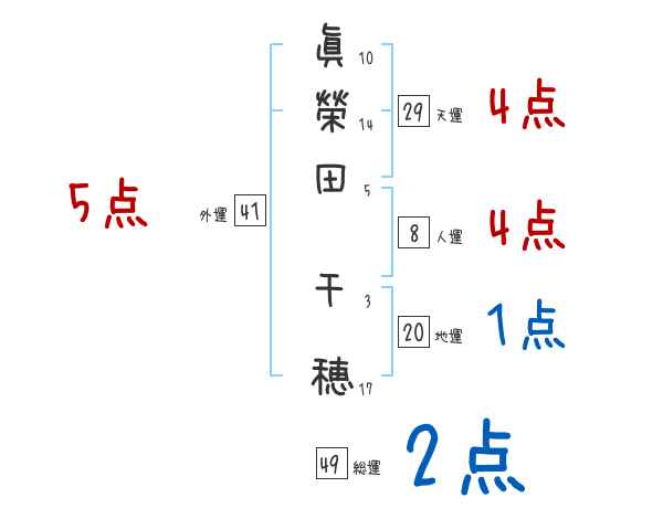 天運![]() | 眞榮田千穂さんの天運は29画の4つ星!完全主義で才能がある。厳格な心の持ち主。 家系が持つ宿命的な運勢を表します。祖先から受け継いだ苗字ですので自分の力が及びません。家柄を象徴します。 |