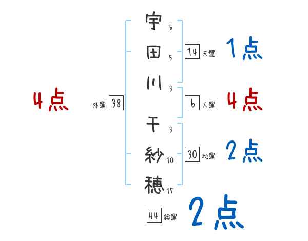 天運![]() | 宇田川千紗穂さんの天運は14画の1つ星!人に対して優しいがストレスを溜め込みがち。人間関係のトラブルを避けるよう気をつけましょう。 家系が持つ宿命的な運勢を表します。祖先から受け継いだ苗字ですので自分の力が及びません。家柄を象徴します。 |