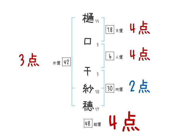 外運![]() | 樋口千紗穂さんの外運は42画の3つ星!病気に注意。多芸であるが消極的でおとなしい。 生活面を象徴する運勢です。外部から受ける影響力を表し、結婚運、家庭運や職場、環境への順応性を表します。 |