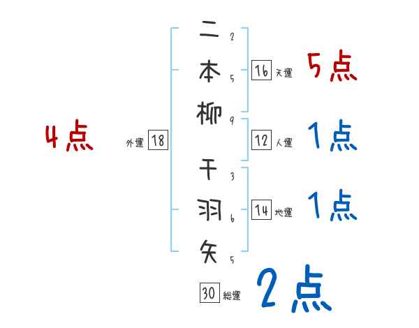 天運![]() | 二本柳千羽矢さんの天運は16画の5つ星!人望が厚く大きく発展する。逆転成功が見える。 家系が持つ宿命的な運勢を表します。祖先から受け継いだ苗字ですので自分の力が及びません。家柄を象徴します。 |