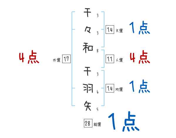外運![]() | 千々和千羽矢さんの外運は17画の4つ星!積極的な行動力。地位を気づき財産を手に入れる。純粋な心と直感力。 生活面を象徴する運勢です。外部から受ける影響力を表し、結婚運、家庭運や職場、環境への順応性を表します。 |