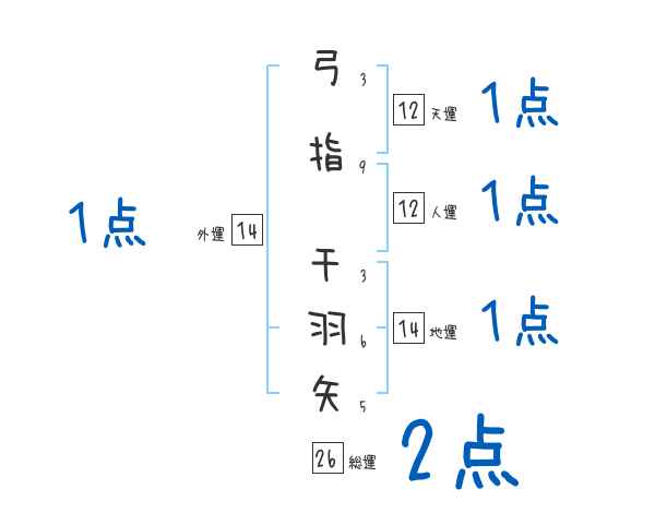 総運![]() | 弓指千羽矢さんの総運は26画の2つ星!波瀾万丈かも。信頼できる人を大事にしましょう。 あなたの人生を表す1番重要な運勢です。生涯を通じて影響する総合運となり、主に50歳以降の晩年期に影響を及ぼします。 |