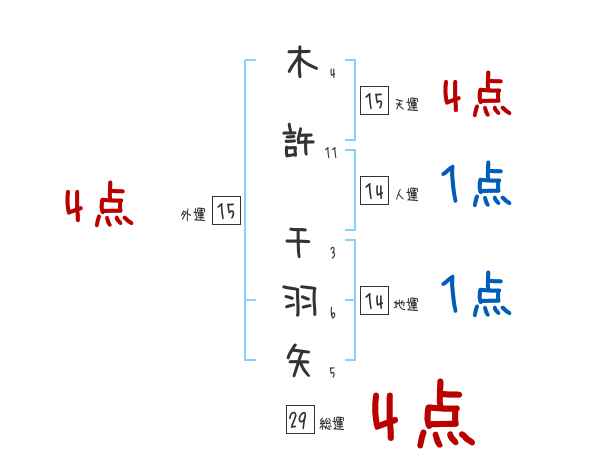 天運![]() | 木許千羽矢さんの天運は15画の4つ星!人徳があり出世する。順調に物事を進め円満な人生。 家系が持つ宿命的な運勢を表します。祖先から受け継いだ苗字ですので自分の力が及びません。家柄を象徴します。 |