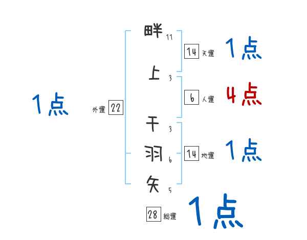 天運![]() | 畔上千羽矢さんの天運は14画の1つ星!人に対して優しいがストレスを溜め込みがち。人間関係のトラブルを避けるよう気をつけましょう。 家系が持つ宿命的な運勢を表します。祖先から受け継いだ苗字ですので自分の力が及びません。家柄を象徴します。 |
