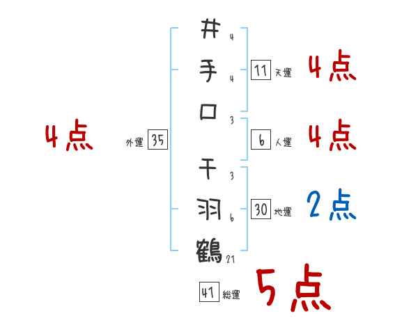 外運![]() | 井手口千羽鶴さんの外運は35画の4つ星!温厚な性格で感受性が高い。穏和な性格で人望が厚い。 生活面を象徴する運勢です。外部から受ける影響力を表し、結婚運、家庭運や職場、環境への順応性を表します。 |
