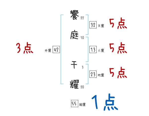 天運![]() | 饗庭千耀さんの天運は32画の5つ星!柔軟性があり成功する。チャンスが多く金運が良い。 家系が持つ宿命的な運勢を表します。祖先から受け継いだ苗字ですので自分の力が及びません。家柄を象徴します。 |