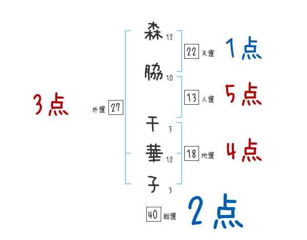 天運![]() | 森脇千華子さんの天運は22画の1つ星!努力することが苦手ないっぽう手先が器用。芸術性にも優れる。 家系が持つ宿命的な運勢を表します。祖先から受け継いだ苗字ですので自分の力が及びません。家柄を象徴します。 |