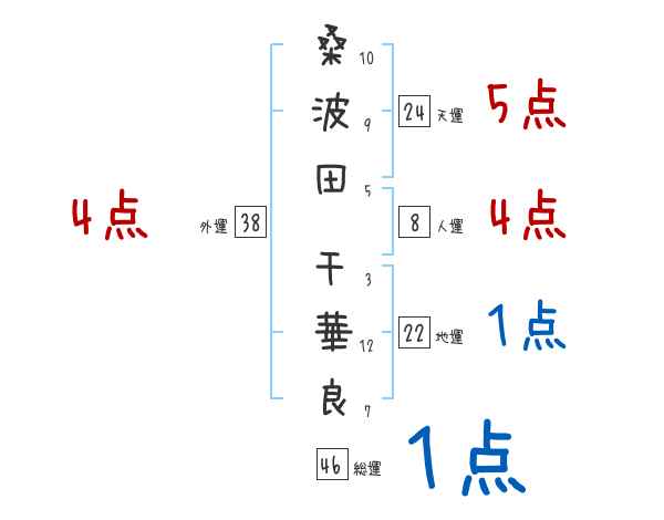天運![]() | 桑波田千華良さんの天運は24画の5つ星!家庭運が良く順調な人生。金運にも恵まれる。 家系が持つ宿命的な運勢を表します。祖先から受け継いだ苗字ですので自分の力が及びません。家柄を象徴します。 |