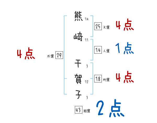 外運![]() | 熊﨑千賀子さんの外運は29画の4つ星!完全主義で才能がある。厳格な心の持ち主。 生活面を象徴する運勢です。外部から受ける影響力を表し、結婚運、家庭運や職場、環境への順応性を表します。 |