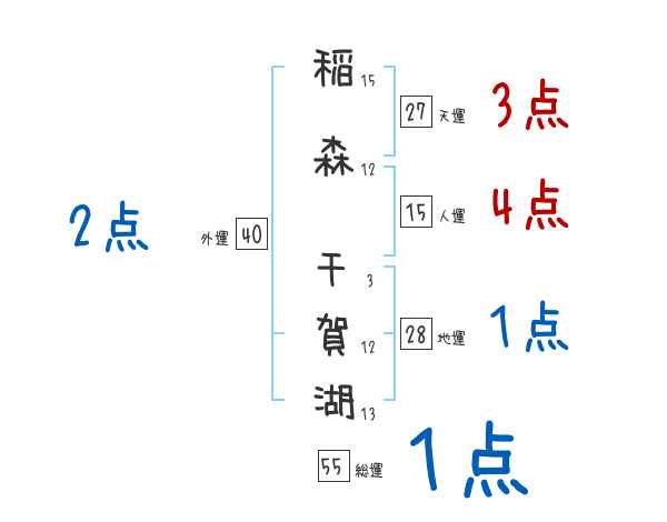 人運![]() | 稲森千賀湖さんの人運は15画の4つ星!人徳があり出世する。順調に物事を進め円満な人生。 性格や才能などを表す2番目に重要な運勢です。人間関係や協調性、社会的な成功に影響します。主に20歳から50歳ぐらいまでの中年期の運勢を表します。 |