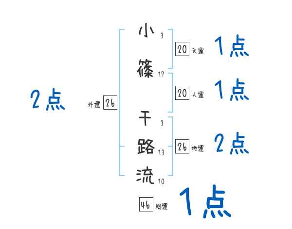 外運![]() | 小篠千路流さんの外運は26画の2つ星!波瀾万丈かも。信頼できる人を大事にしましょう。 生活面を象徴する運勢です。外部から受ける影響力を表し、結婚運、家庭運や職場、環境への順応性を表します。 |