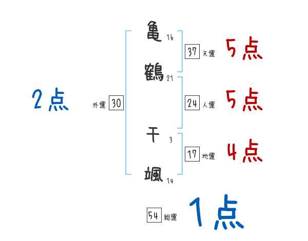 外運![]() | 亀鶴千颯さんの外運は30画の2つ星!浮き沈みの激しさに注意しましょう。 生活面を象徴する運勢です。外部から受ける影響力を表し、結婚運、家庭運や職場、環境への順応性を表します。 |