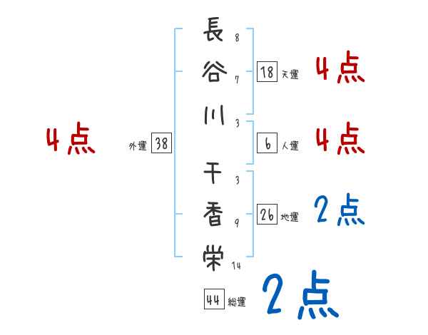 総運![]() | 長谷川千香栄さんの総運は44画の2つ星!誠実で慎重な性格。物事を考えすぎないように注意しましょう。 あなたの人生を表す1番重要な運勢です。生涯を通じて影響する総合運となり、主に50歳以降の晩年期に影響を及ぼします。 |
