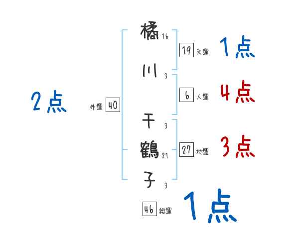 総運![]() | 橘川千鶴子さんの総運は46画の1つ星!迷走することが多く苦労するかも。目先のことにとらわれないように。 あなたの人生を表す1番重要な運勢です。生涯を通じて影響する総合運となり、主に50歳以降の晩年期に影響を及ぼします。 |