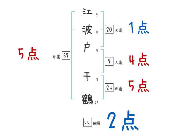 天運![]() | 江波戸千鶴さんの天運は20画の1つ星!社交が苦手。人とは違った才能があり波乱万丈な人生かも。 家系が持つ宿命的な運勢を表します。祖先から受け継いだ苗字ですので自分の力が及びません。家柄を象徴します。 |