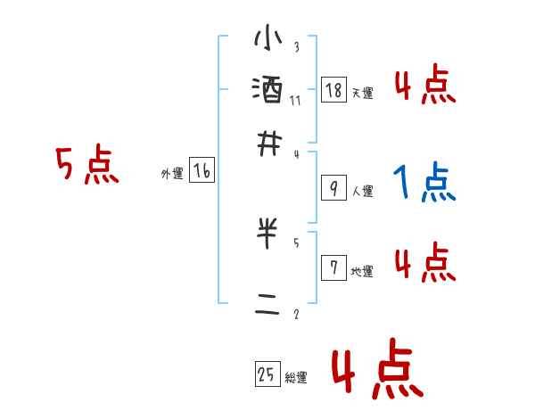 天運![]() | 小酒井半二さんの天運は18画の4つ星!情熱的で剛気。忍耐力があり信頼される。 家系が持つ宿命的な運勢を表します。祖先から受け継いだ苗字ですので自分の力が及びません。家柄を象徴します。 |