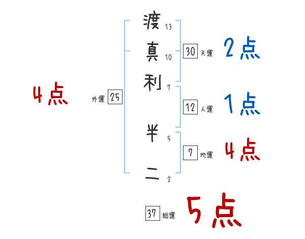 天運![]() | 渡真利半二さんの天運は30画の2つ星!浮き沈みの激しさに注意しましょう。 家系が持つ宿命的な運勢を表します。祖先から受け継いだ苗字ですので自分の力が及びません。家柄を象徴します。 |