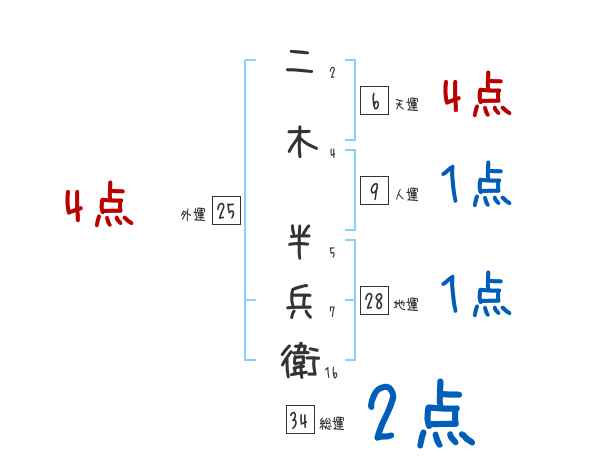 地運![]() | 二木半兵衛さんの地運は28画の1つ星!家庭環境に注意。スポーツで活躍できる能力があるかも。 個性を表す基礎的な運勢です。性格形成や対人関係、行動力など家庭環境に影響されます。主に誕生してから20歳くらいまでの若年期の運勢を表します。 |