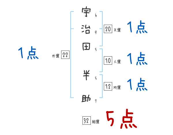 総運![]() | 宇治田半助さんの総運は32画の5つ星!柔軟性があり成功する。チャンスが多く金運が良い。 あなたの人生を表す1番重要な運勢です。生涯を通じて影響する総合運となり、主に50歳以降の晩年期に影響を及ぼします。 |