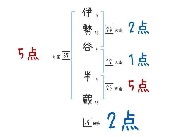 外運![]() | 伊勢谷半蔵さんの外運は37画の5つ星!努力家で順応性に優れる。現実的な考え方ができ忠実に物事をこなす。 生活面を象徴する運勢です。外部から受ける影響力を表し、結婚運、家庭運や職場、環境への順応性を表します。 |