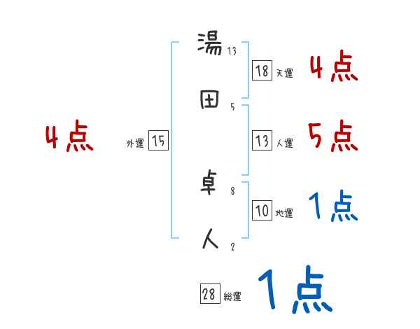 総運![]() | 湯田卓人さんの総運は28画の1つ星!家庭環境に注意。スポーツで活躍できる能力があるかも。 あなたの人生を表す1番重要な運勢です。生涯を通じて影響する総合運となり、主に50歳以降の晩年期に影響を及ぼします。 |