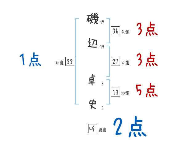 外運![]() | 磯辺卓史さんの外運は22画の1つ星!努力することが苦手ないっぽう手先が器用。芸術性にも優れる。 生活面を象徴する運勢です。外部から受ける影響力を表し、結婚運、家庭運や職場、環境への順応性を表します。 |