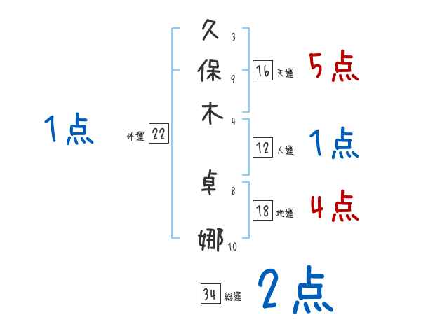総運![]() | 久保木卓娜さんの総運は34画の2つ星!独創性に優れるが、自尊心が強く災難に注意しましょう。 あなたの人生を表す1番重要な運勢です。生涯を通じて影響する総合運となり、主に50歳以降の晩年期に影響を及ぼします。 |