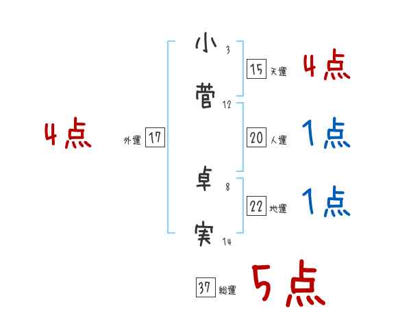 外運![]() | 小菅卓実さんの外運は17画の4つ星!積極的な行動力。地位を気づき財産を手に入れる。純粋な心と直感力。 生活面を象徴する運勢です。外部から受ける影響力を表し、結婚運、家庭運や職場、環境への順応性を表します。 |