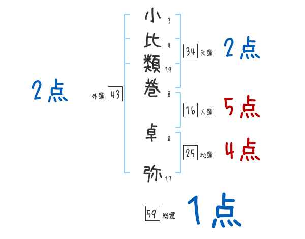人運![]() | 小比類巻卓弥さんの人運は16画の5つ星!人望が厚く大きく発展する。逆転成功が見える。 性格や才能などを表す2番目に重要な運勢です。人間関係や協調性、社会的な成功に影響します。主に20歳から50歳ぐらいまでの中年期の運勢を表します。 |