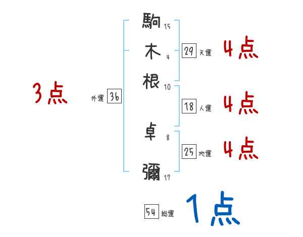 外運![]() | 駒木根卓彌さんの外運は36画の3つ星!先見性が豊かです。多少神経質で苦労することも。 生活面を象徴する運勢です。外部から受ける影響力を表し、結婚運、家庭運や職場、環境への順応性を表します。 |