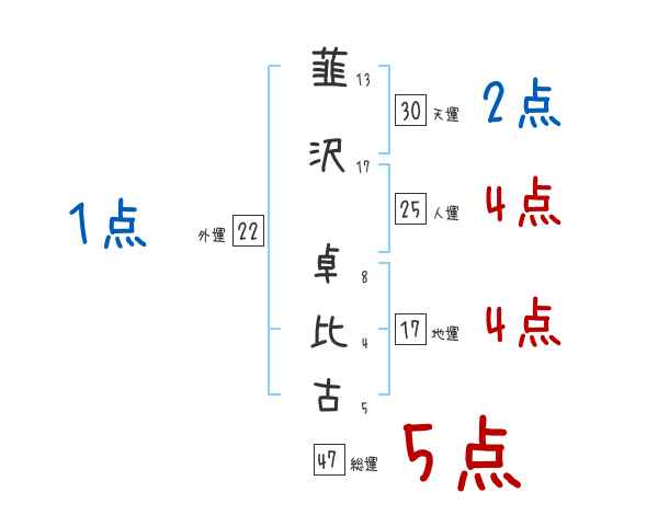 外運![]() | 韮沢卓比古さんの外運は22画の1つ星!努力することが苦手ないっぽう手先が器用。芸術性にも優れる。 生活面を象徴する運勢です。外部から受ける影響力を表し、結婚運、家庭運や職場、環境への順応性を表します。 |
