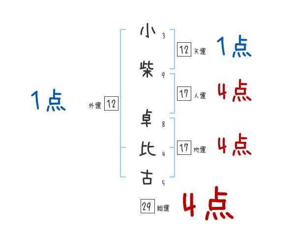 天運![]() | 小柴卓比古さんの天運は12画の1つ星!簡単な失敗で諦めてしまいやすいかも。着実に行動すると良いでしょう。 家系が持つ宿命的な運勢を表します。祖先から受け継いだ苗字ですので自分の力が及びません。家柄を象徴します。 |