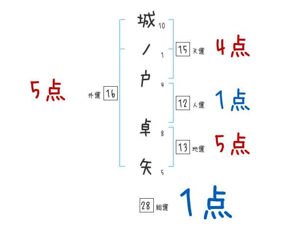 外運![]() | 城ノ戸卓矢さんの外運は16画の5つ星!人望が厚く大きく発展する。逆転成功が見える。 生活面を象徴する運勢です。外部から受ける影響力を表し、結婚運、家庭運や職場、環境への順応性を表します。 |