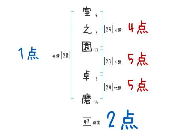天運![]() | 室之園卓磨さんの天運は25画の4つ星!個性があり才能があふれる。強運の持ち主で発展する。 家系が持つ宿命的な運勢を表します。祖先から受け継いだ苗字ですので自分の力が及びません。家柄を象徴します。 |