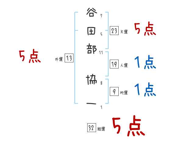総運![]() | 谷田部協一さんの総運は32画の5つ星!柔軟性があり成功する。チャンスが多く金運が良い。 あなたの人生を表す1番重要な運勢です。生涯を通じて影響する総合運となり、主に50歳以降の晩年期に影響を及ぼします。 |