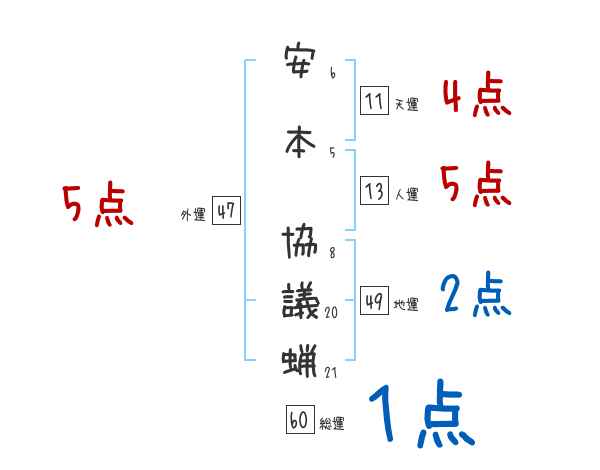 人運![]() | 安本協議蝋さんの人運は13画の5つ星!才能に恵まれ人気がある。名声を手に入れる。円満な人生。 性格や才能などを表す2番目に重要な運勢です。人間関係や協調性、社会的な成功に影響します。主に20歳から50歳ぐらいまでの中年期の運勢を表します。 |