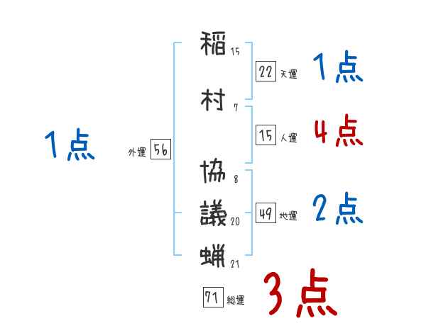 外運![]() | 稲村協議蝋さんの外運は56画の1つ星!消極的で無気力になりがち。誠実な気持ちが必要でしょう。 生活面を象徴する運勢です。外部から受ける影響力を表し、結婚運、家庭運や職場、環境への順応性を表します。 |